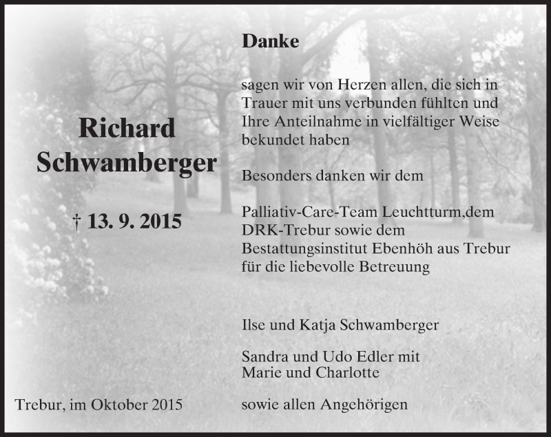 Hier finden Sie alle Traueranzeigen aus der Zeitung, die bisher für Richard Schwamberger erschienen sind. Weitere Traueranzeigen, die in der Zeitung erscheinen, werden hier ebenfalls aufgelistet