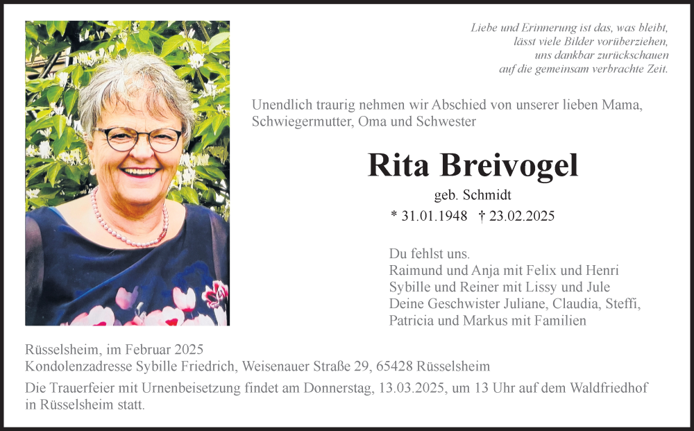 Hier finden Sie alle Traueranzeigen aus der Zeitung, die bisher für Rita Breivogel erschienen sind. Weitere Traueranzeigen, die in der Zeitung erscheinen, werden hier ebenfalls aufgelistet
