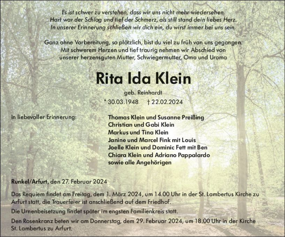 Hier finden Sie alle Traueranzeigen aus der Zeitung, die bisher für Rita Ida Klein erschienen sind. Weitere Traueranzeigen, die in der Zeitung erscheinen, werden hier ebenfalls aufgelistet