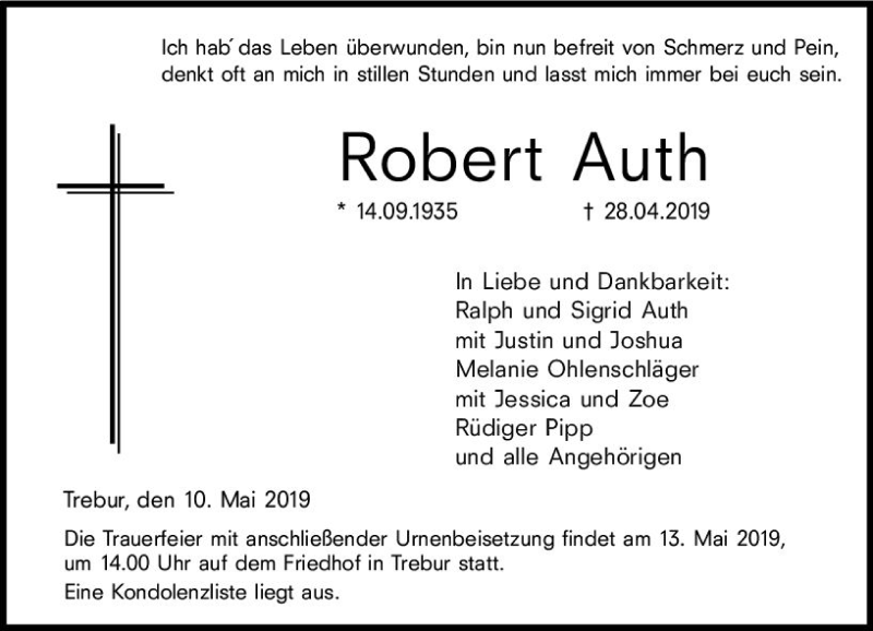 Hier finden Sie alle Traueranzeigen aus der Zeitung, die bisher für Robert Auth erschienen sind. Weitere Traueranzeigen, die in der Zeitung erscheinen, werden hier ebenfalls aufgelistet