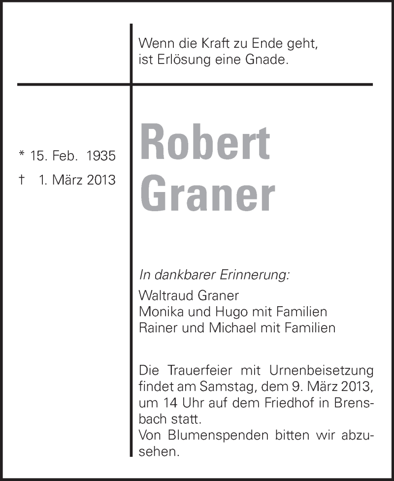 Hier finden Sie alle Traueranzeigen aus der Zeitung, die bisher für Robert Graner erschienen sind. Weitere Traueranzeigen, die in der Zeitung erscheinen, werden hier ebenfalls aufgelistet