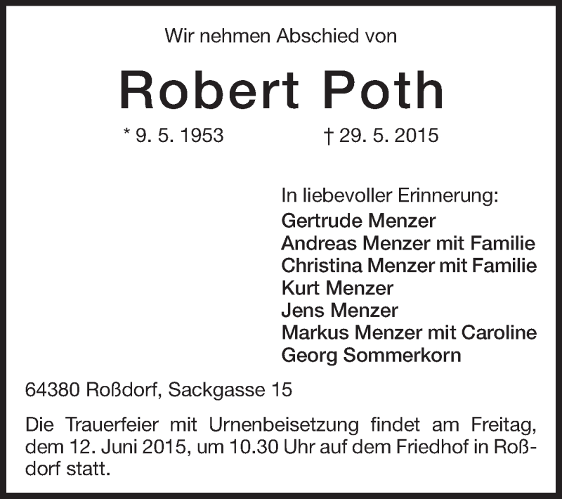 Hier finden Sie alle Traueranzeigen aus der Zeitung, die bisher für Robert Poth erschienen sind. Weitere Traueranzeigen, die in der Zeitung erscheinen, werden hier ebenfalls aufgelistet