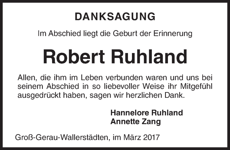 Hier finden Sie alle Traueranzeigen aus der Zeitung, die bisher für Robert Ruhland erschienen sind. Weitere Traueranzeigen, die in der Zeitung erscheinen, werden hier ebenfalls aufgelistet