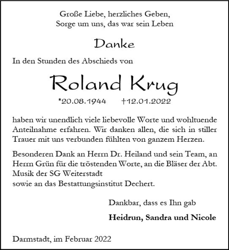 Hier finden Sie alle Traueranzeigen aus der Zeitung, die bisher für Roland Krug erschienen sind. Weitere Traueranzeigen, die in der Zeitung erscheinen, werden hier ebenfalls aufgelistet