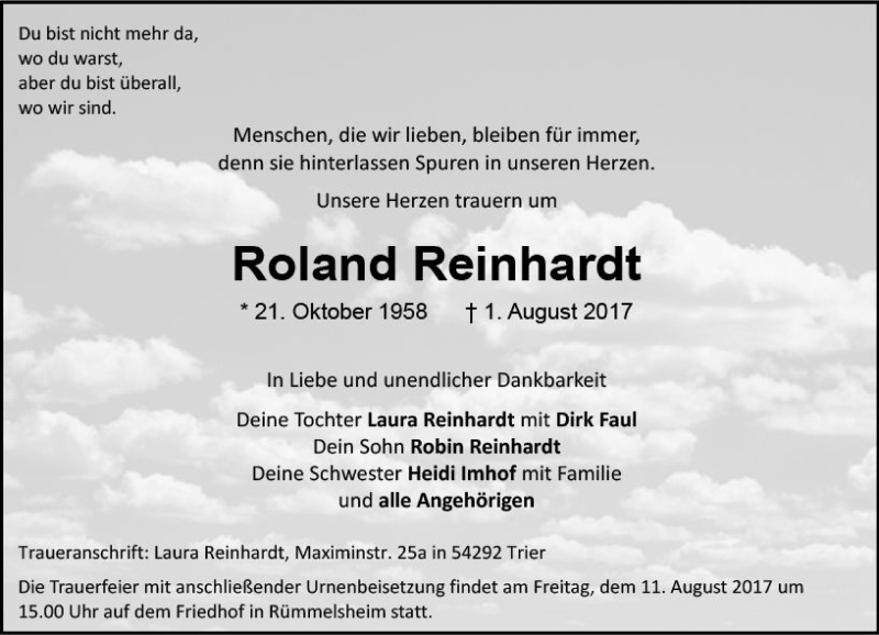 Hier finden Sie alle Traueranzeigen aus der Zeitung, die bisher für Roland Reinhardt erschienen sind. Weitere Traueranzeigen, die in der Zeitung erscheinen, werden hier ebenfalls aufgelistet