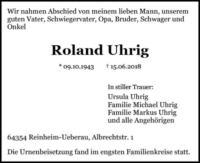 Hier finden Sie alle Traueranzeigen aus der Zeitung, die bisher für Roland Uhrig erschienen sind. Weitere Traueranzeigen, die in der Zeitung erscheinen, werden hier ebenfalls aufgelistet