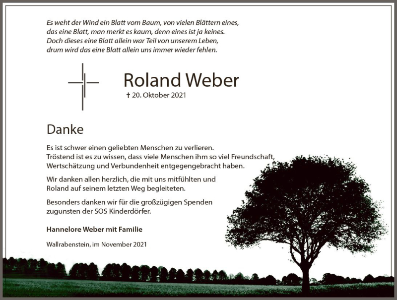 Hier finden Sie alle Traueranzeigen aus der Zeitung, die bisher für Roland Weber erschienen sind. Weitere Traueranzeigen, die in der Zeitung erscheinen, werden hier ebenfalls aufgelistet
