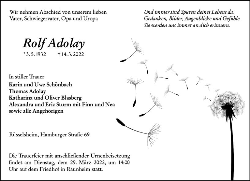 Hier finden Sie alle Traueranzeigen aus der Zeitung, die bisher für Rolf Adolay erschienen sind. Weitere Traueranzeigen, die in der Zeitung erscheinen, werden hier ebenfalls aufgelistet