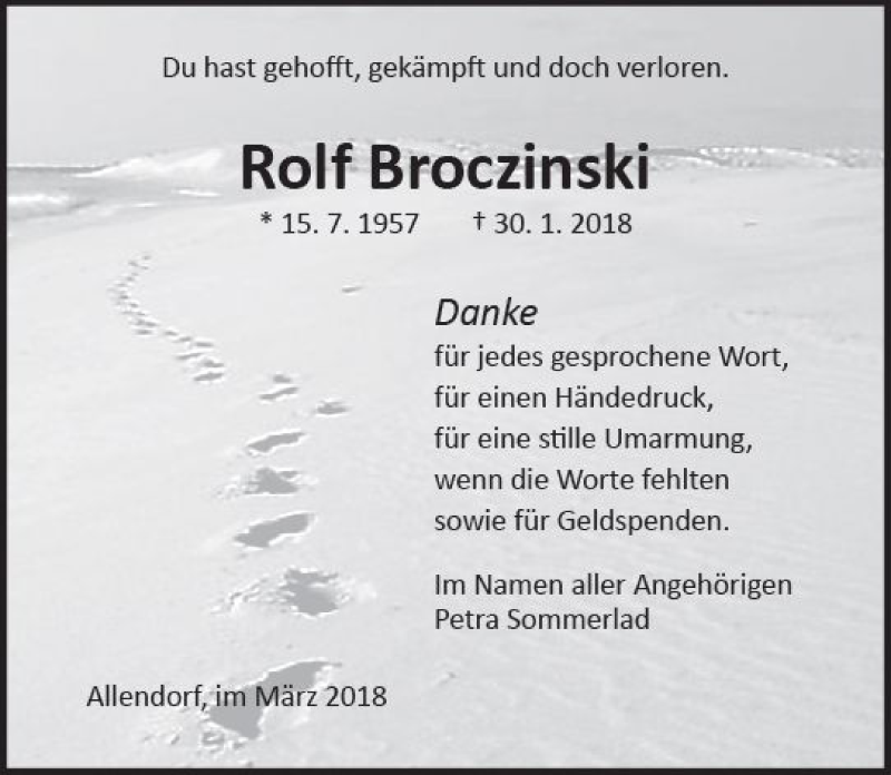 Hier finden Sie alle Traueranzeigen aus der Zeitung, die bisher für Rolf Broczinski erschienen sind. Weitere Traueranzeigen, die in der Zeitung erscheinen, werden hier ebenfalls aufgelistet