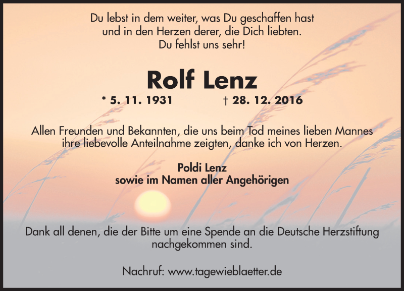 Hier finden Sie alle Traueranzeigen aus der Zeitung, die bisher für Rolf Lenz erschienen sind. Weitere Traueranzeigen, die in der Zeitung erscheinen, werden hier ebenfalls aufgelistet