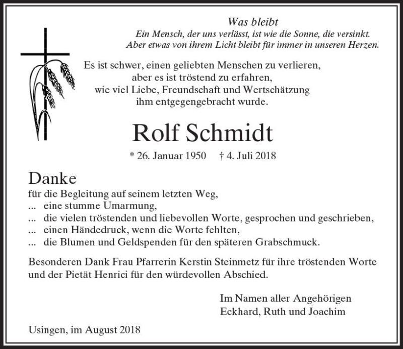 Hier finden Sie alle Traueranzeigen aus der Zeitung, die bisher für Rolf Schmidt erschienen sind. Weitere Traueranzeigen, die in der Zeitung erscheinen, werden hier ebenfalls aufgelistet