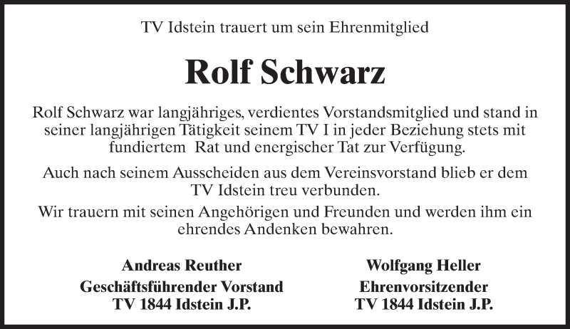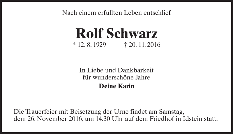 Hier finden Sie alle Traueranzeigen aus der Zeitung, die bisher für Rolf Schwarz erschienen sind. Weitere Traueranzeigen, die in der Zeitung erscheinen, werden hier ebenfalls aufgelistet