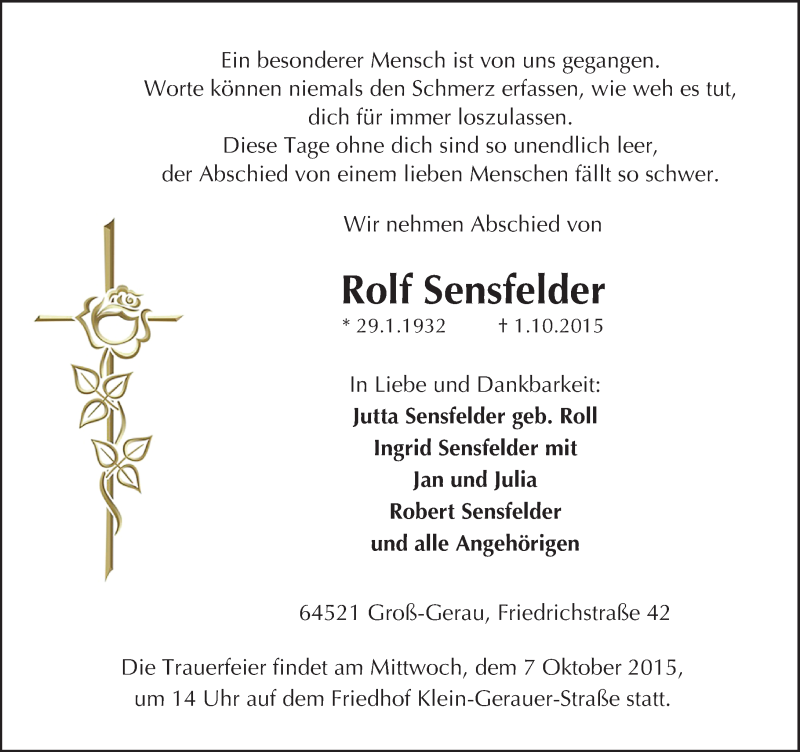 Hier finden Sie alle Traueranzeigen aus der Zeitung, die bisher für Rolf Sensfelder erschienen sind. Weitere Traueranzeigen, die in der Zeitung erscheinen, werden hier ebenfalls aufgelistet