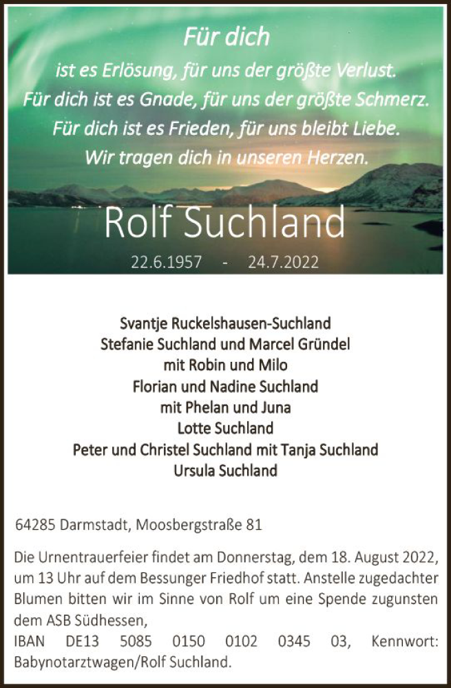 Hier finden Sie alle Traueranzeigen aus der Zeitung, die bisher für Rolf Suchland erschienen sind. Weitere Traueranzeigen, die in der Zeitung erscheinen, werden hier ebenfalls aufgelistet