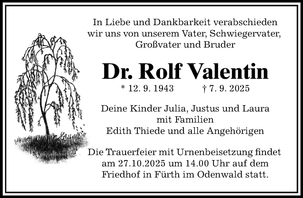 Hier finden Sie alle Traueranzeigen aus der Zeitung, die bisher für Rolf Valentin erschienen sind. Weitere Traueranzeigen, die in der Zeitung erscheinen, werden hier ebenfalls aufgelistet