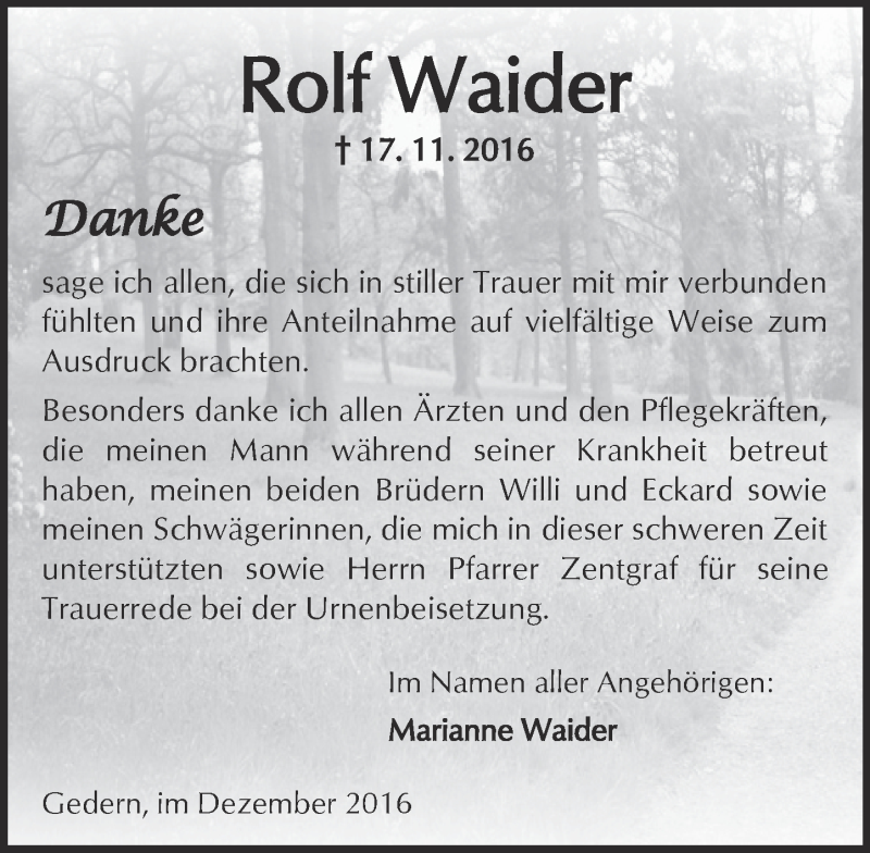 Hier finden Sie alle Traueranzeigen aus der Zeitung, die bisher für Rolf Waider erschienen sind. Weitere Traueranzeigen, die in der Zeitung erscheinen, werden hier ebenfalls aufgelistet