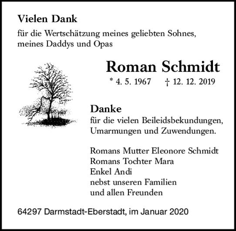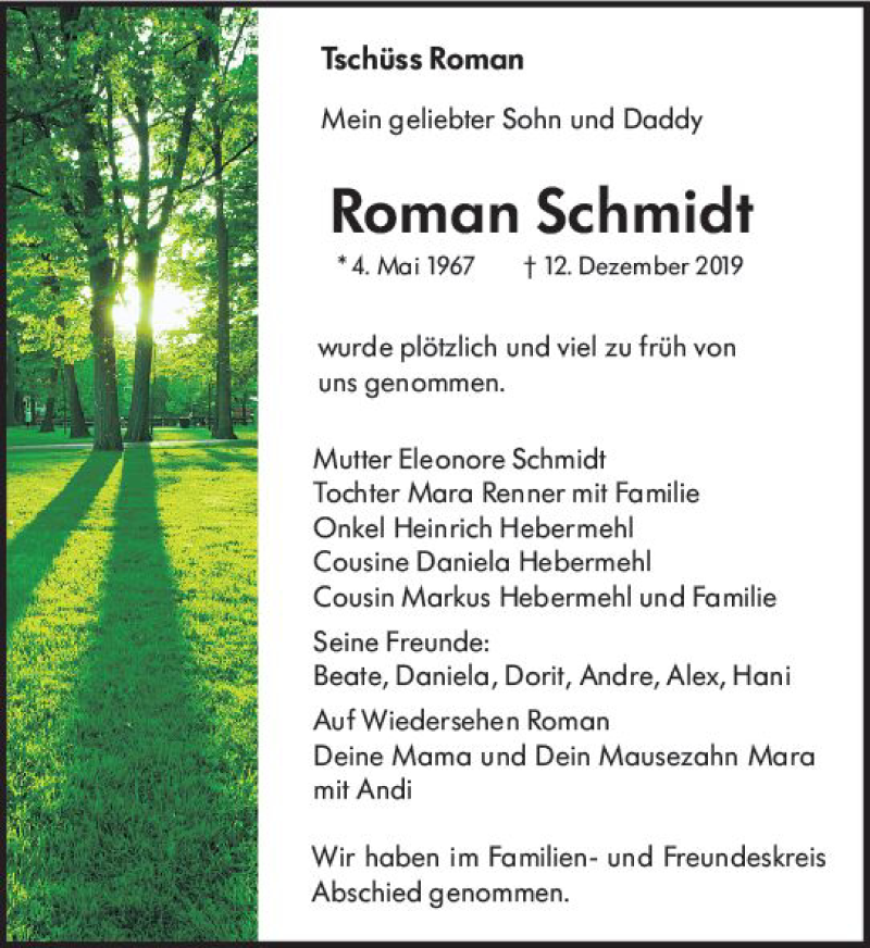 Hier finden Sie alle Traueranzeigen aus der Zeitung, die bisher für Roman Schmidt erschienen sind. Weitere Traueranzeigen, die in der Zeitung erscheinen, werden hier ebenfalls aufgelistet