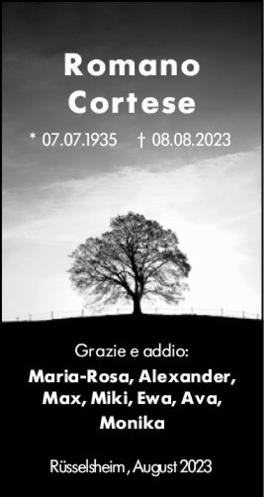 Hier finden Sie alle Traueranzeigen aus der Zeitung, die bisher für Romano Cortese erschienen sind. Weitere Traueranzeigen, die in der Zeitung erscheinen, werden hier ebenfalls aufgelistet