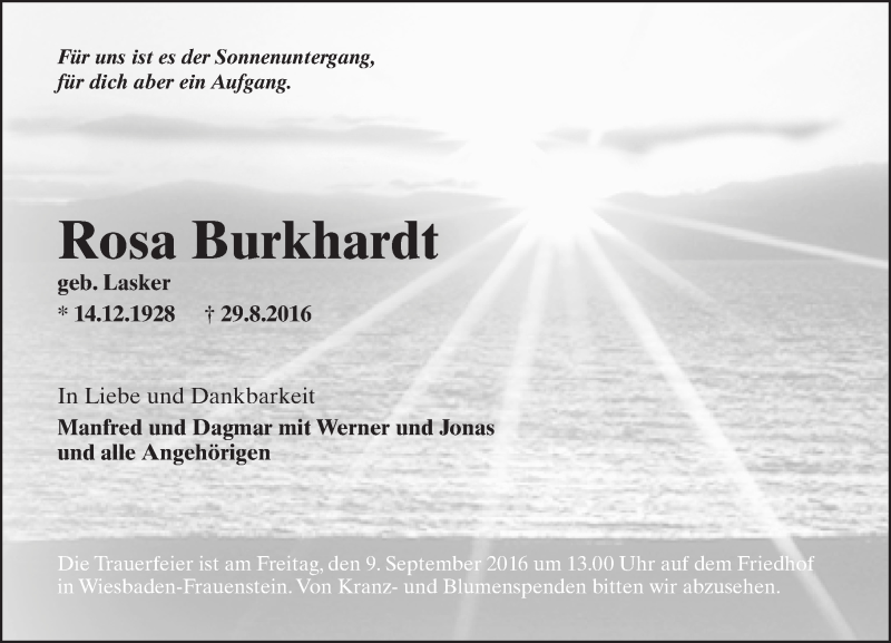 Hier finden Sie alle Traueranzeigen aus der Zeitung, die bisher für Rosa Burkhardt erschienen sind. Weitere Traueranzeigen, die in der Zeitung erscheinen, werden hier ebenfalls aufgelistet