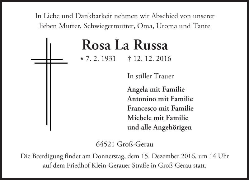 Hier finden Sie alle Traueranzeigen aus der Zeitung, die bisher für Rosa La Russa erschienen sind. Weitere Traueranzeigen, die in der Zeitung erscheinen, werden hier ebenfalls aufgelistet