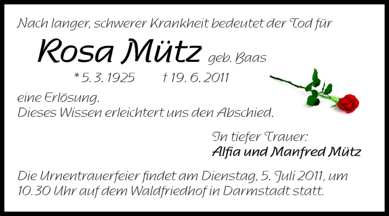 Hier finden Sie alle Traueranzeigen aus der Zeitung, die bisher für Rosa Mütz erschienen sind. Weitere Traueranzeigen, die in der Zeitung erscheinen, werden hier ebenfalls aufgelistet