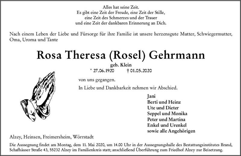 Hier finden Sie alle Traueranzeigen aus der Zeitung, die bisher für Rosa Theresa Gehrmann erschienen sind. Weitere Traueranzeigen, die in der Zeitung erscheinen, werden hier ebenfalls aufgelistet