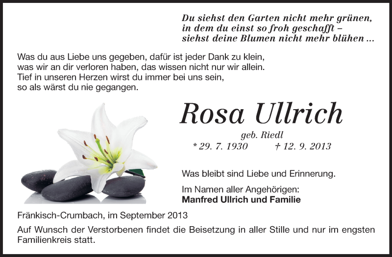 Hier finden Sie alle Traueranzeigen aus der Zeitung, die bisher für Rosa Ullrich erschienen sind. Weitere Traueranzeigen, die in der Zeitung erscheinen, werden hier ebenfalls aufgelistet