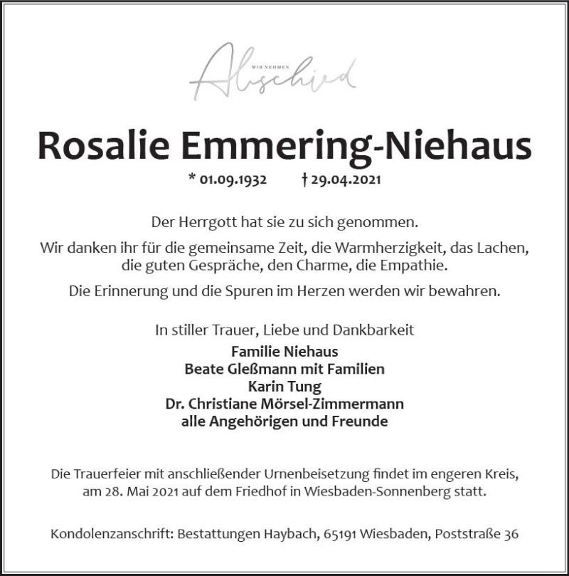 Hier finden Sie alle Traueranzeigen aus der Zeitung, die bisher für Rosalie Emmering-Niehaus erschienen sind. Weitere Traueranzeigen, die in der Zeitung erscheinen, werden hier ebenfalls aufgelistet