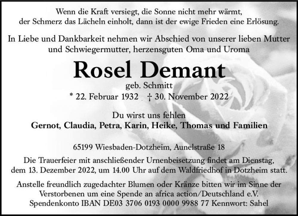 Hier finden Sie alle Traueranzeigen aus der Zeitung, die bisher für Rosel Deman erschienen sind. Weitere Traueranzeigen, die in der Zeitung erscheinen, werden hier ebenfalls aufgelistet