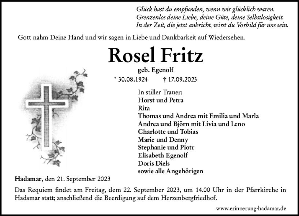 Hier finden Sie alle Traueranzeigen aus der Zeitung, die bisher für Rosel Fritz erschienen sind. Weitere Traueranzeigen, die in der Zeitung erscheinen, werden hier ebenfalls aufgelistet