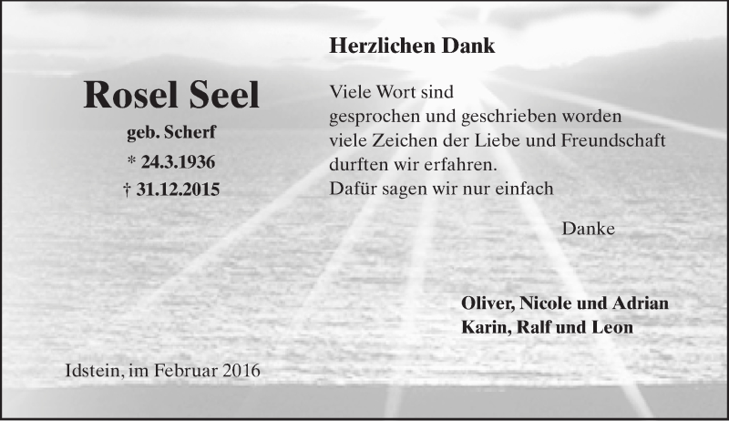Hier finden Sie alle Traueranzeigen aus der Zeitung, die bisher für Rosel Seel erschienen sind. Weitere Traueranzeigen, die in der Zeitung erscheinen, werden hier ebenfalls aufgelistet