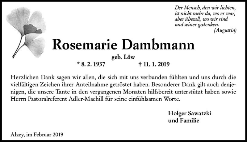 Hier finden Sie alle Traueranzeigen aus der Zeitung, die bisher für Rosemarie Dambmann erschienen sind. Weitere Traueranzeigen, die in der Zeitung erscheinen, werden hier ebenfalls aufgelistet