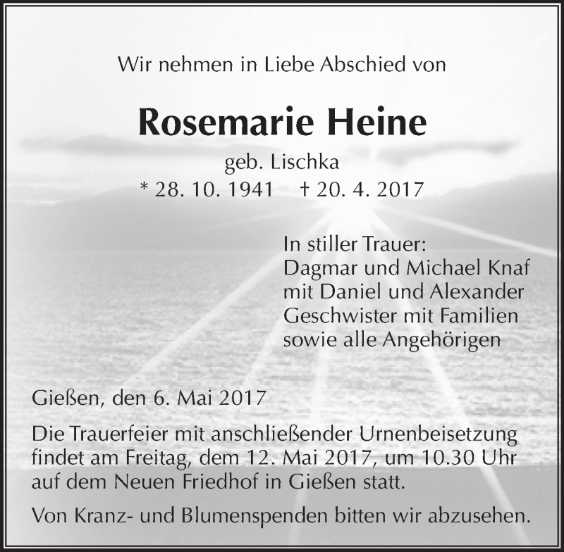 Hier finden Sie alle Traueranzeigen aus der Zeitung, die bisher für Rosemarie Heine erschienen sind. Weitere Traueranzeigen, die in der Zeitung erscheinen, werden hier ebenfalls aufgelistet