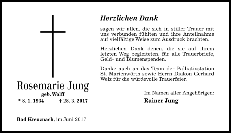 Hier finden Sie alle Traueranzeigen aus der Zeitung, die bisher für Rosemarie Jung erschienen sind. Weitere Traueranzeigen, die in der Zeitung erscheinen, werden hier ebenfalls aufgelistet