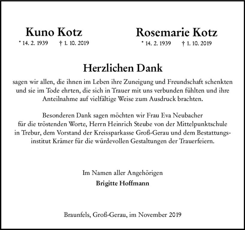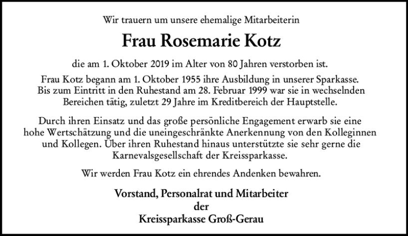 Hier finden Sie alle Traueranzeigen aus der Zeitung, die bisher für Rosemarie Kotz erschienen sind. Weitere Traueranzeigen, die in der Zeitung erscheinen, werden hier ebenfalls aufgelistet
