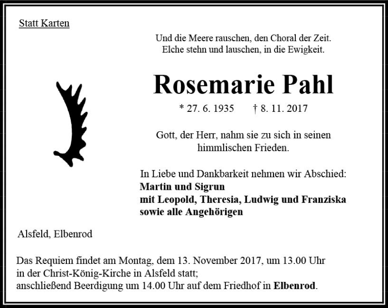 Hier finden Sie alle Traueranzeigen aus der Zeitung, die bisher für Rosemarie Pahl erschienen sind. Weitere Traueranzeigen, die in der Zeitung erscheinen, werden hier ebenfalls aufgelistet