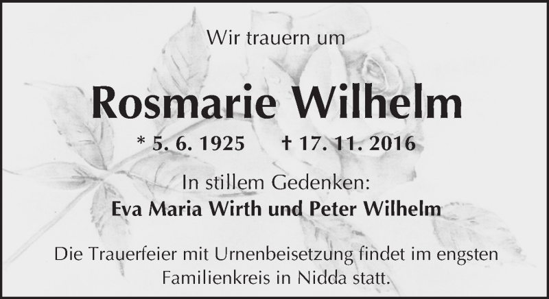 Hier finden Sie alle Traueranzeigen aus der Zeitung, die bisher für Rosmarie Wilhelm erschienen sind. Weitere Traueranzeigen, die in der Zeitung erscheinen, werden hier ebenfalls aufgelistet