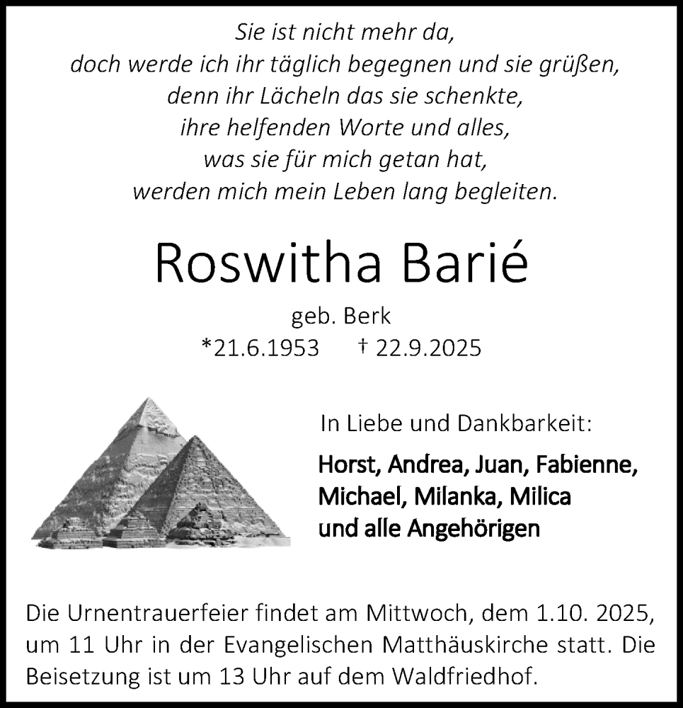 Hier finden Sie alle Traueranzeigen aus der Zeitung, die bisher für Roswitha Barié erschienen sind. Weitere Traueranzeigen, die in der Zeitung erscheinen, werden hier ebenfalls aufgelistet