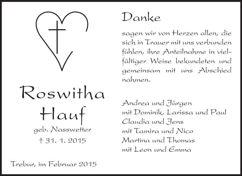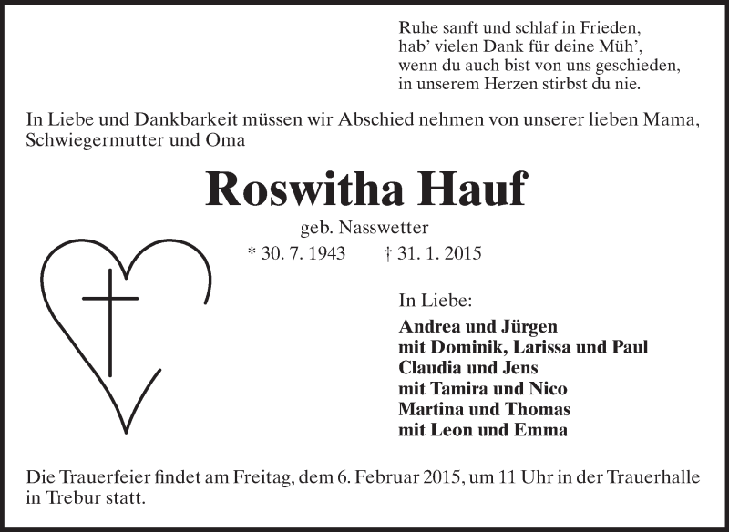 Hier finden Sie alle Traueranzeigen aus der Zeitung, die bisher für Roswitha Hauf erschienen sind. Weitere Traueranzeigen, die in der Zeitung erscheinen, werden hier ebenfalls aufgelistet