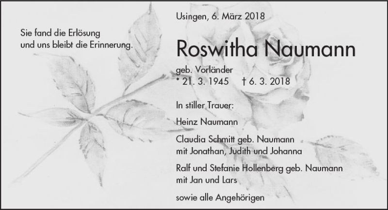 Hier finden Sie alle Traueranzeigen aus der Zeitung, die bisher für Roswitha Naumann erschienen sind. Weitere Traueranzeigen, die in der Zeitung erscheinen, werden hier ebenfalls aufgelistet