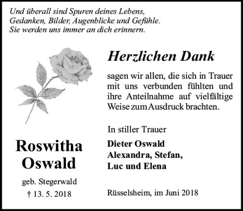 Hier finden Sie alle Traueranzeigen aus der Zeitung, die bisher für Roswitha Oswald erschienen sind. Weitere Traueranzeigen, die in der Zeitung erscheinen, werden hier ebenfalls aufgelistet