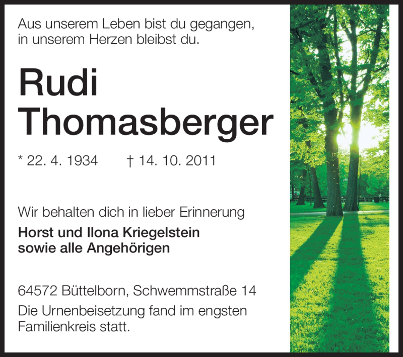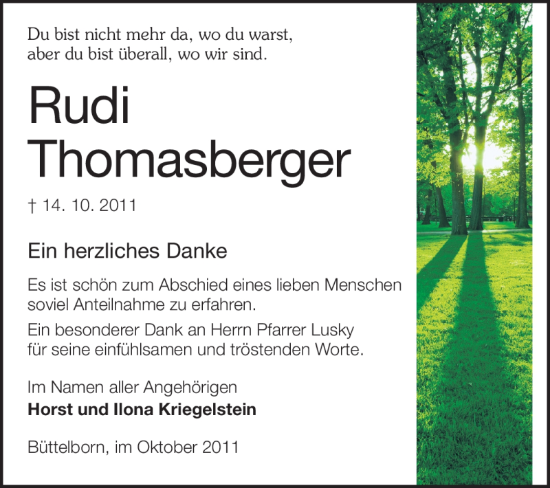 Hier finden Sie alle Traueranzeigen aus der Zeitung, die bisher für Rudi Thomasberger erschienen sind. Weitere Traueranzeigen, die in der Zeitung erscheinen, werden hier ebenfalls aufgelistet