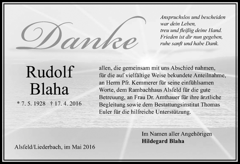 Hier finden Sie alle Traueranzeigen aus der Zeitung, die bisher für Rudolf Blaha erschienen sind. Weitere Traueranzeigen, die in der Zeitung erscheinen, werden hier ebenfalls aufgelistet