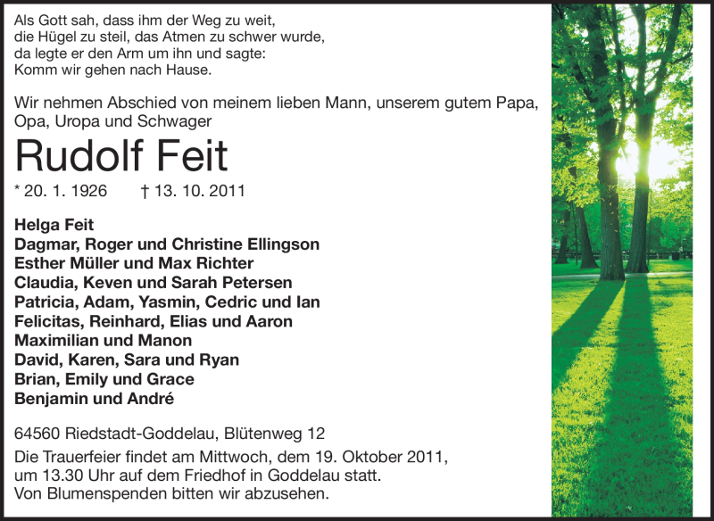Hier finden Sie alle Traueranzeigen aus der Zeitung, die bisher für Rudolf Feit erschienen sind. Weitere Traueranzeigen, die in der Zeitung erscheinen, werden hier ebenfalls aufgelistet