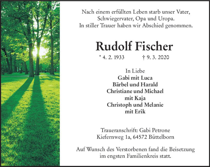 Hier finden Sie alle Traueranzeigen aus der Zeitung, die bisher für Rudolf Fischer erschienen sind. Weitere Traueranzeigen, die in der Zeitung erscheinen, werden hier ebenfalls aufgelistet