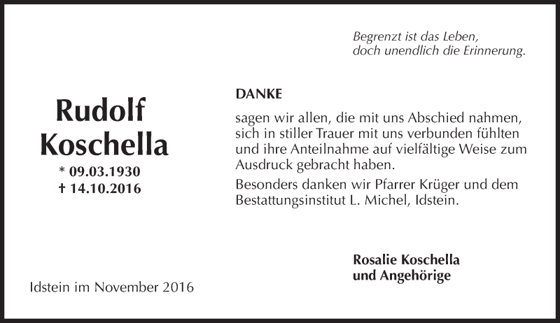 Hier finden Sie alle Traueranzeigen aus der Zeitung, die bisher für Rudolf Koschella erschienen sind. Weitere Traueranzeigen, die in der Zeitung erscheinen, werden hier ebenfalls aufgelistet
