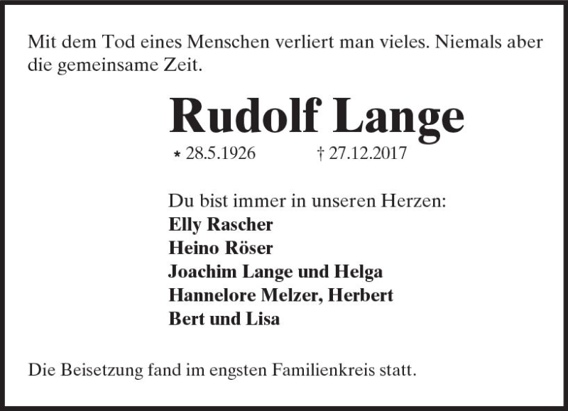 Hier finden Sie alle Traueranzeigen aus der Zeitung, die bisher für Rudolf Lange erschienen sind. Weitere Traueranzeigen, die in der Zeitung erscheinen, werden hier ebenfalls aufgelistet