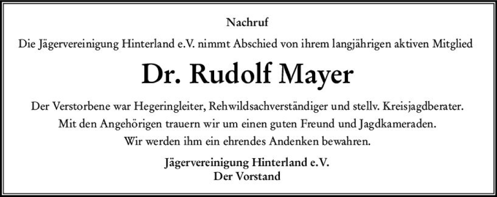 Hier finden Sie alle Traueranzeigen aus der Zeitung, die bisher für Rudolf Mayer erschienen sind. Weitere Traueranzeigen, die in der Zeitung erscheinen, werden hier ebenfalls aufgelistet