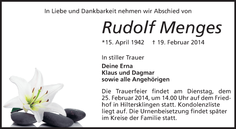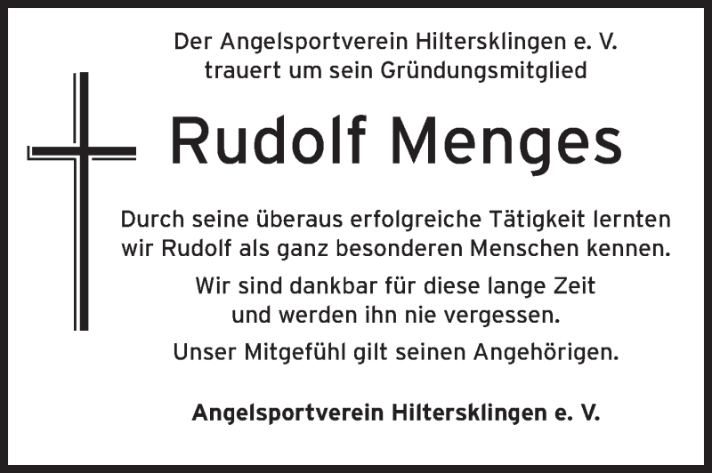 Hier finden Sie alle Traueranzeigen aus der Zeitung, die bisher für Rudolf Menges erschienen sind. Weitere Traueranzeigen, die in der Zeitung erscheinen, werden hier ebenfalls aufgelistet