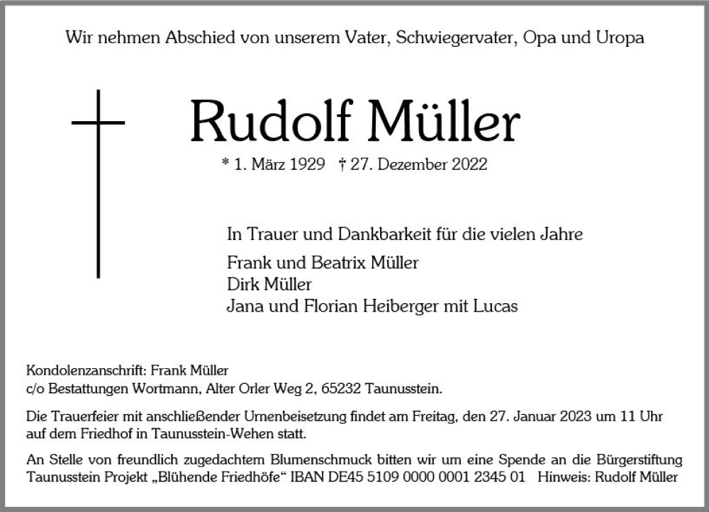 Hier finden Sie alle Traueranzeigen aus der Zeitung, die bisher für Rudolf Müller erschienen sind. Weitere Traueranzeigen, die in der Zeitung erscheinen, werden hier ebenfalls aufgelistet
